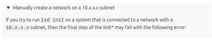 If you try to run `lxd init` on a system that is connected to a network with a `10.x.x.x` subnet,